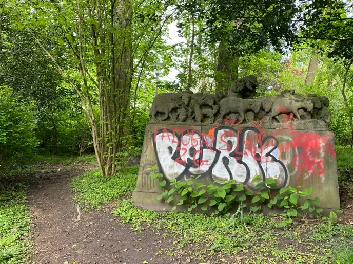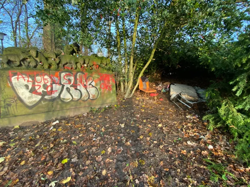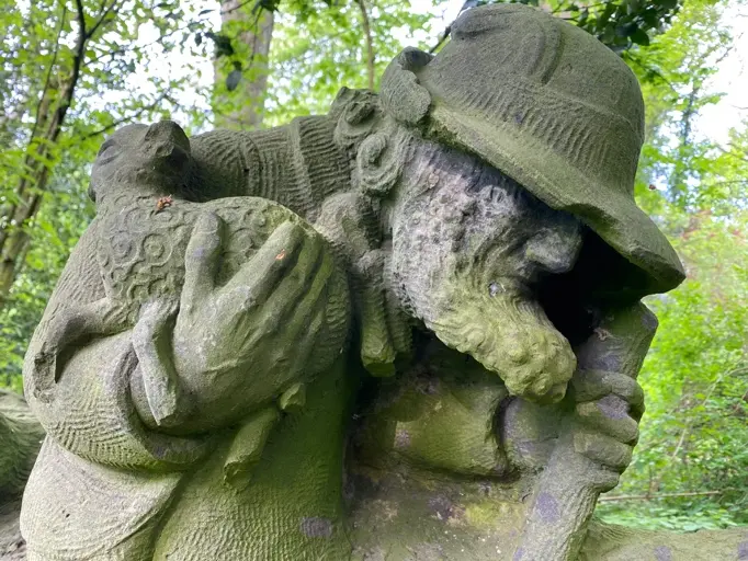 Weil das Werk im Stein signiert ist (links), wissen wir, dass es von Karl Spethmann stammt. Der ist kein Unbekannter, wie verschiedene Internetadressen zeigen.[1] Aber es findet sich nichts zu diesem speziellen Werk und schon gar nicht, wer es wann mit welchem Motiv dort aufgestellt hat. Im Altona Verzeichnis denkmalgeschützter Bauwerke wird das Monument nicht aufgeführt.[2] Und auch im Park selbst führt es ein Nischendasein: man kann ihm nur auf einem Trampelpfad abseits der offiziellen Wege näher kommen. Anfang Dezember 2024 bot sich das folgende Bild (oben): Ein Obdachloser hatte sich direkt neben dem Schäfer unter einem Blätterdach „häuslich“ eingerichtet. Hatte er sich in die Obhut des guten Hirten begeben?