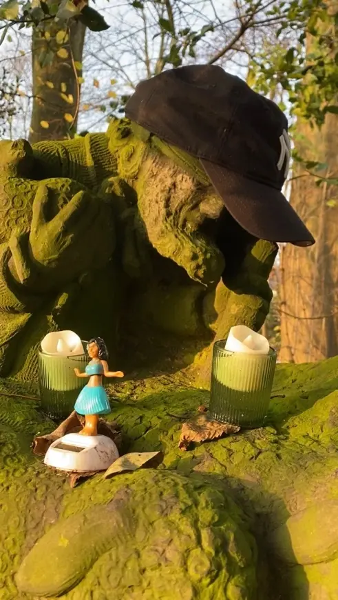Die Nahaufnahme (links) zeigt als skurrilstes Element eine batteriegetriebene hüftenschwingende Tanzpuppe zwischen 2 elektrischen Kerzen. Noch vor Weihnachten war die ganze „Idylle“ zerstört und der Weihnachtsschmuck verschwunden; Täter unbekannt.Eine rührende, rätselhafte und letztlich traurige Geschichte. Mit meinem Bericht wird sie selbst zu einem kleinen „Denk-mal!“.