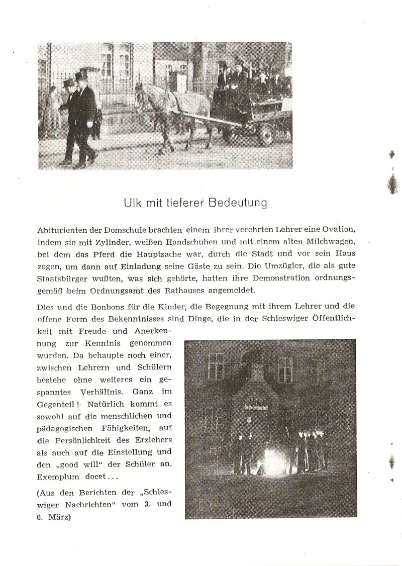 G. Börm – entfernt verwandt mit mir, der nach jahrelangem Wühlen in den Archiven eine geographisch-historische Dissertation über „die Landschaft Stapelholm“ verfasste, K.v.Sperber, Heiner Lütcke, Sohn des En-Lehrers Lütcke, Heiners Spezialität war es, Latein- und Griechisch-Arbeiten in der Hälfte der dafür vorgesehen Zeit fehlerfrei zu schaffen.; das „Traumpaar“ der ellenlange Raguse und dessen Freund, der eher klein gebliebene Wiebe, Asmus Finzen, dessen Amerika-Berichte mich inspirierten, mich auch für ein Auslandsjahr in den USA zu bewerben.