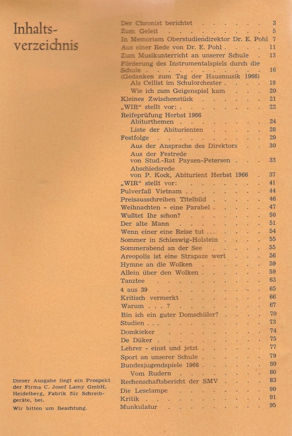 Heinz Münzmaier hat mir div. Ausgaben der Domschulzeitung „WIR“ geschickt, deren Redaktionsleiter er bis zum Heft 12 – 1961 war. Ein Inhaltsverzeichnis taucht erstmalig im Heft 20/66 auf. Für alle anderen Ausgaben habe ich mit meinen Möglichkeiten Inhaltsverzeichnisse erstellt. Bitteschön: