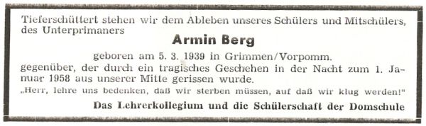 Lehrerkollegium und Schülerschaft – Abschied von Armin Berg, Unterprimaner (Tragisches Geschehen in der Nacht zum 1. Januar 1958)