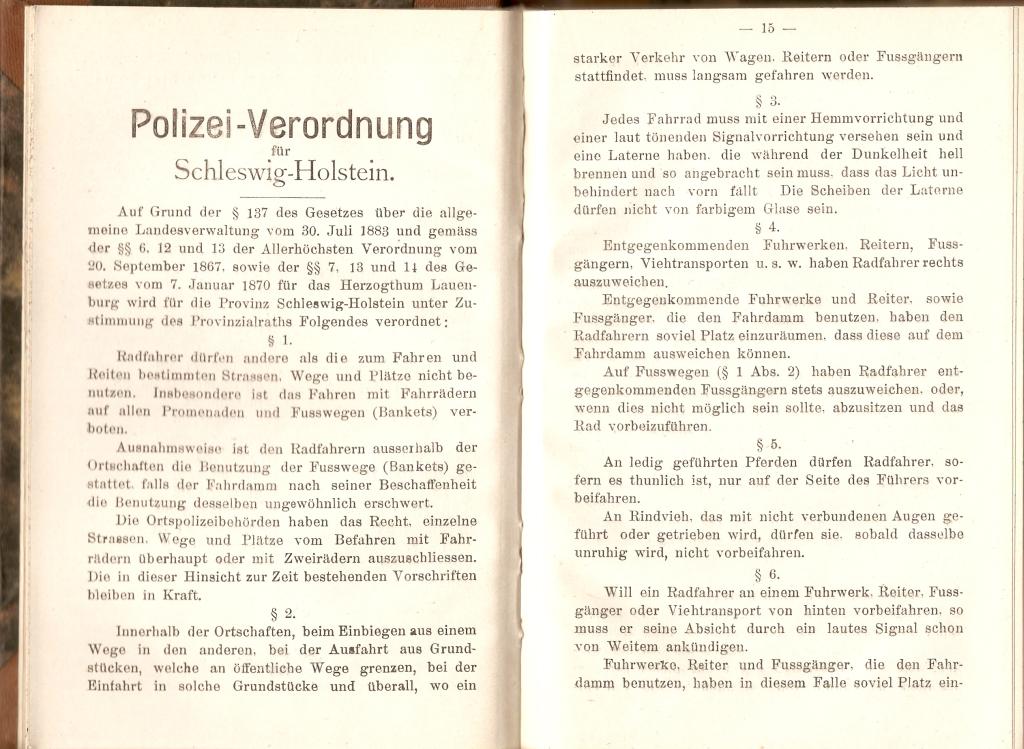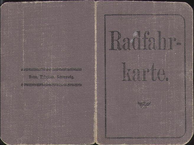 Bundeshotels des Gau 31 in Schleswig sind B. Kösters Hotel, Gottorpstr. 3 und die Thorhalle (H. Sparbier). Einkehrstellen sind der Börsenkeller (W. Müsch) und die Schleihalle (F. Gerhardt). Reparaturwerkstätten sind H. Frahm, Stadtweg, H. Petersen, Friedrichstr. und Klinker, Stadtweg. (Hochrad-Foto aus „Die Reihe Archivbilder SCHLESWIG“ von Holger Rüdel) Links eine preussische Radfahrkarte aus dem Jahr 1914 für den Schüler Karl Clement. War das damals vorgeschrieben?