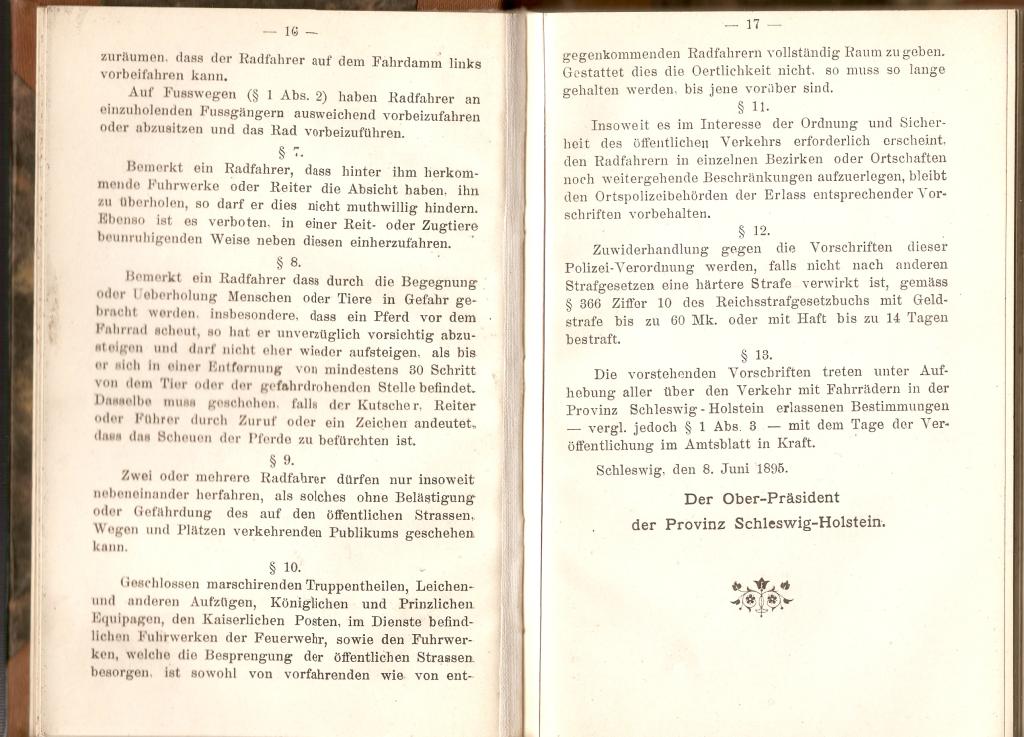§10. Geschlossen marschirenden Truppenteilen, Leichen- und anderen Aufzügen, Königlichen und Prinzlichen Equipagen, den Kaiserlichen Posten, im Dienste befindlichen Fuhrwerken der Feuerwehr, sowie den Fuhrwerken, welche die Besprengung der öffentlichen Straßen besorgen, ist sowohl von vorfahrenden wie auch von entgegenkommenden Radfahrern vollständig Raum zu geben.