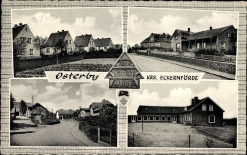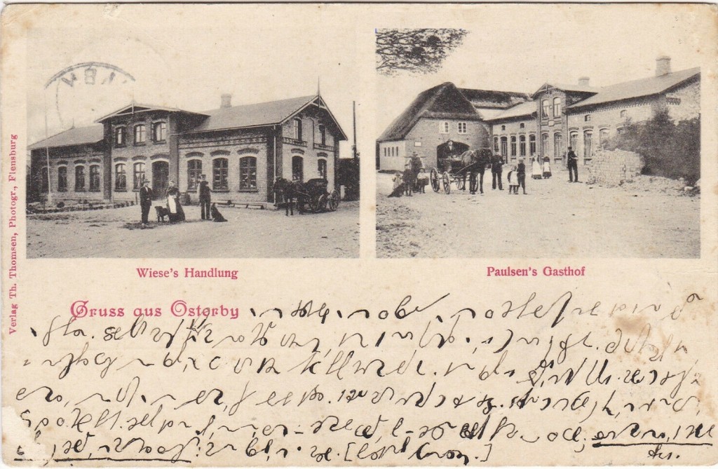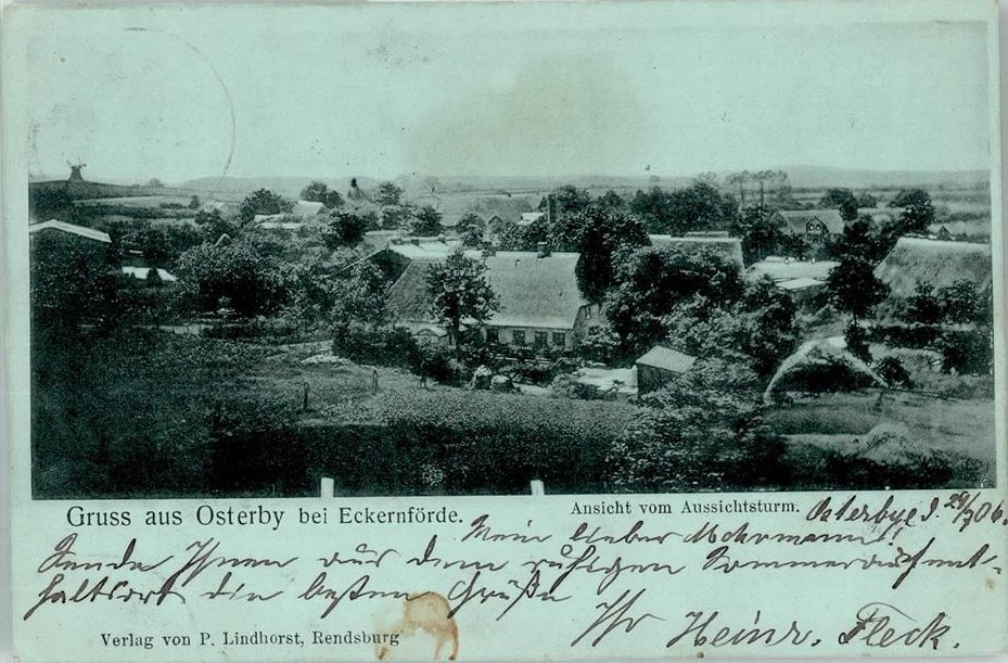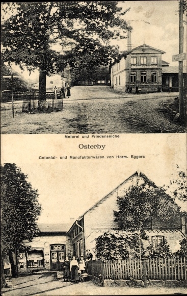 Sonntag, den 7. September 2008: Neues aus Osterby! Endlich haben wir eine Gesamtansicht des Dorfes, eine Ansicht des Gasthauses „Zur Deutschen Eiche„, das Foto einer Fabrik (Meierei?) mit Friedenseiche und dann noch etwas mit der Bezeichung „Doppeleiche„! Warum heißt das Dorf eigentlich Osterby?