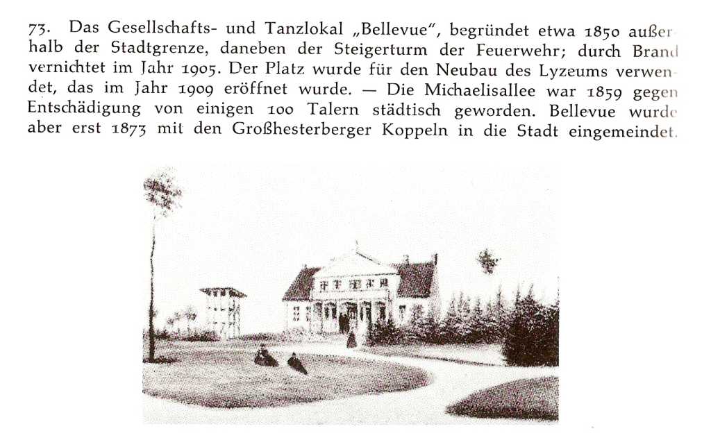 hinter einem freien Platz die Wohnung des bekannten Schriftstellers Hermann Heiberg, daneben das Hotel „Stadt Hamburg“. Die in der Richtung unseres Weges weiterführende Flensburger Strasse, von der sich rechts der Hesterberg abzweigt, um später ihr parallel