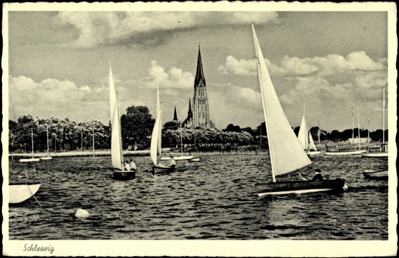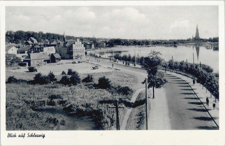 Der von Baumreihen begleitete Weg, auf dem sich Straßenbahn und Eisenbahn kreuzen, lässt unsere Blicke frei über die von leichtem Winde sanft kräuselnden Wellen der blauen Schlei gleiten,
