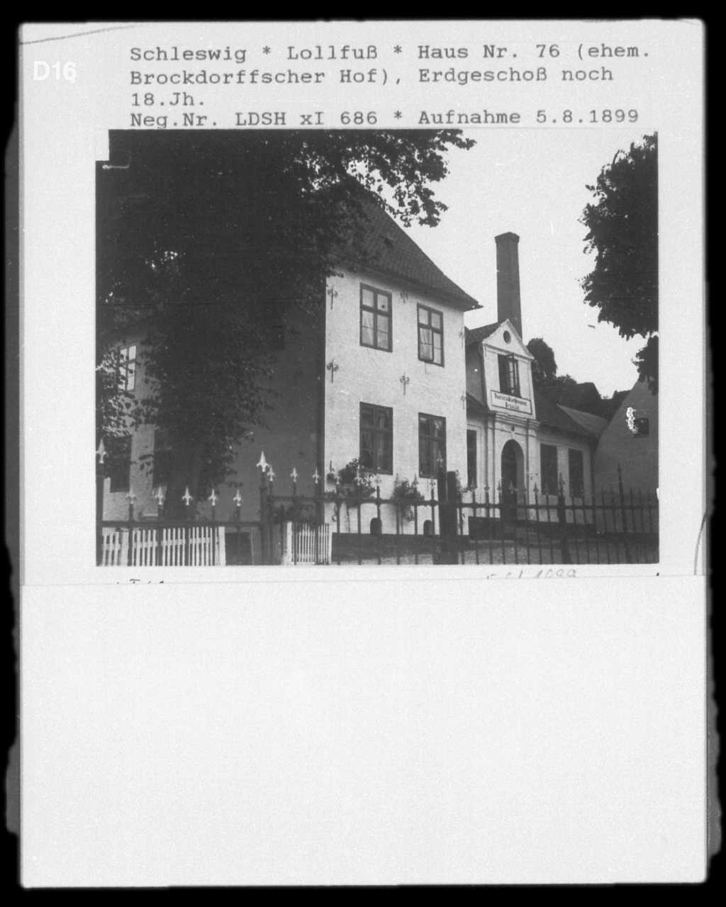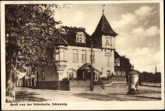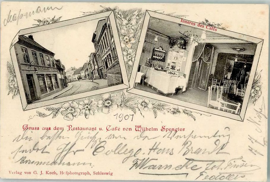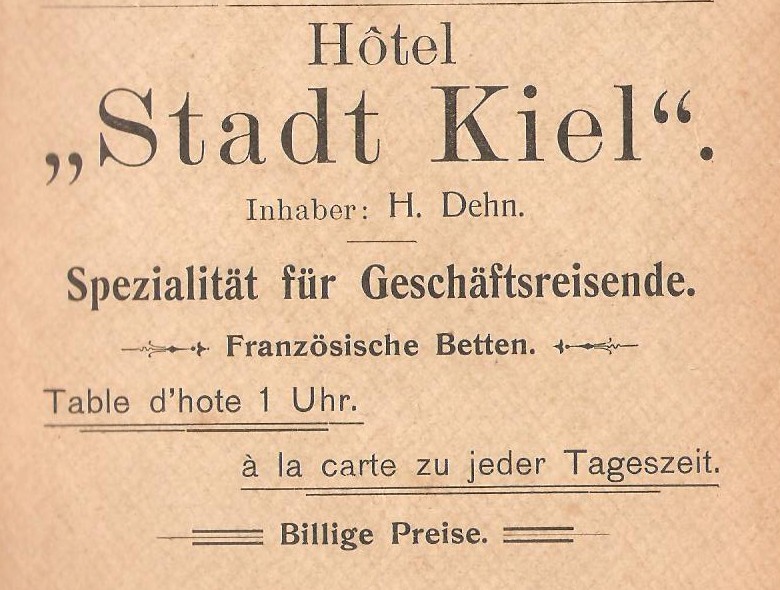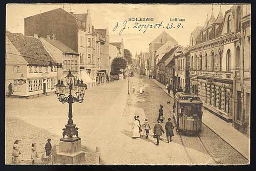 Gegenüber liegt das Hotel „Stadt Kiel“, von dem aus regelmäßige Omnisbusverbindung mit dem durch die Kropper Anstalten des Pastors Paulsen bekannten Kropp unterhalten wird. (Entfernung Schleswig-Kropp rund 12 km.). Links von der Strasse erhebt sich die Brüningsche Bierbrauerei,