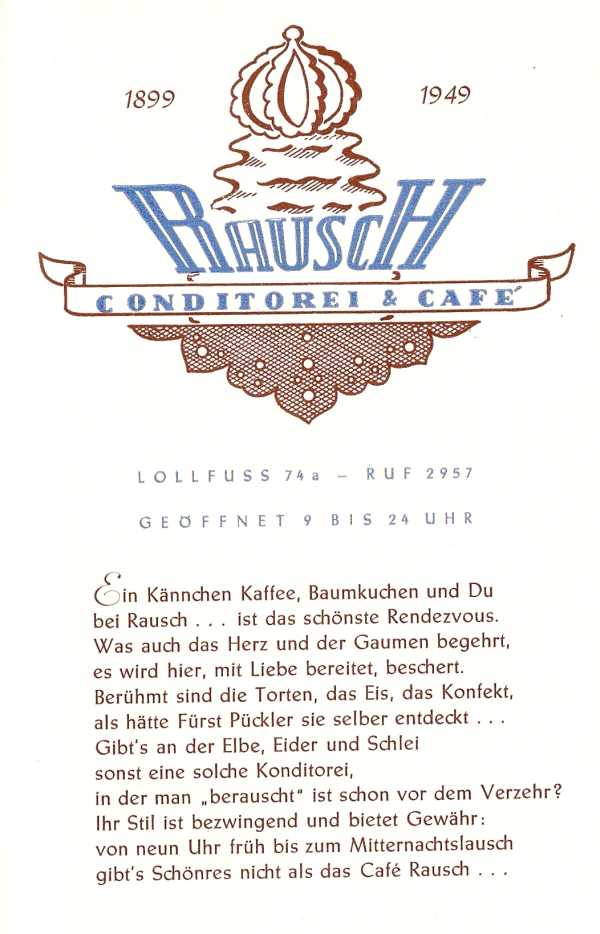 2. Das Werbegedicht von Café Rausch ist typisch 50er Jahre und früher. Danach hat die Werbeindustrie nur noch selten gedichtet :D was man dann „Kreativitaet“, oder war es „Primitivität“?, nannte. :>>