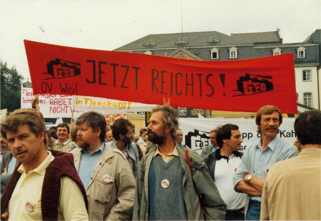 Es war auf eine bundesweiten Demonstration der GdED in Bonn(das Gebäude im Hintergrund ist das Bonner Rathaus), wahrscheinlich mitte der achtziger Jahre, ich weiß es nicht mehr so genau. Alles was ich noch weiß ist, daß es rund um den Bonner Marktplatz kein Bier mehr zu kaufen gab.