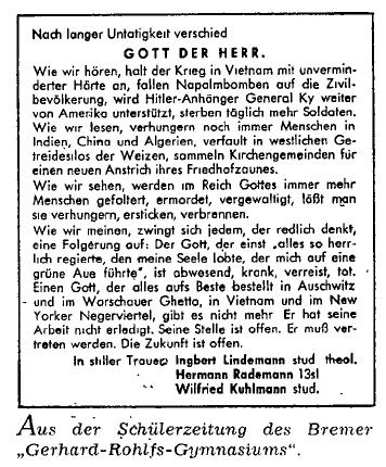 Stud. theol. Ingbert Lindemann hat 1966 für Gott, den Herrn, eine Todesanzeige aufgegeben. Heute ist Ingbert Lindemann ein pensionierter Pastor und Buchautor. Dann war das wohl ein Irrtum, mit dem Tod. Gut zu wissen.