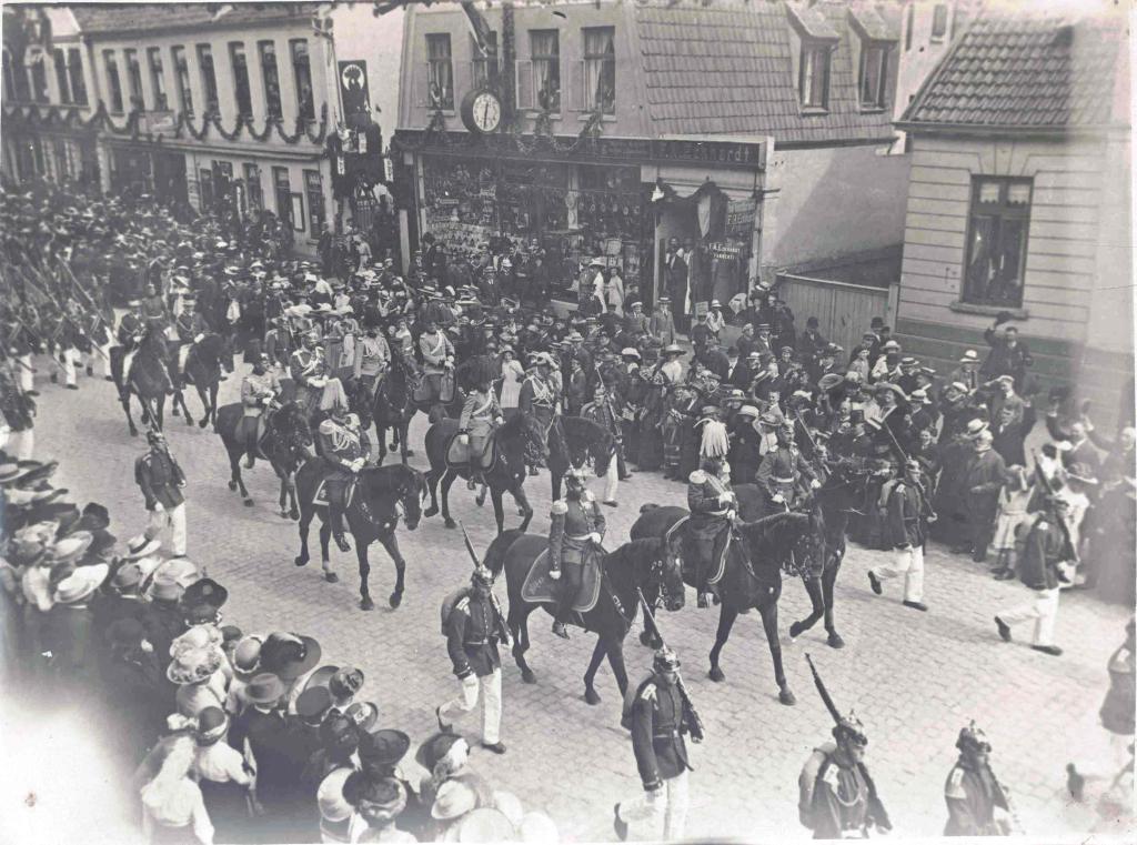 Auf dem Foto ist es kurz nach halb Eins, also sind die Herren auf nüchternen Magen unterwegs; mit Gewehr! In den Krieg zog man 1914 in Schleswig nicht in Galauniform; mit „de Maj-büx“ (!) und „Explosionsfederbusch“ auf’m Helm. Also soll’n die Herrn auf’m Pferd irgendwo festlich essen, wo sie repræsentieren wollen und Glanz verleihen… Spontaner Kriegsauszug im September 1914 oder ‚mal eben so in’s jährliche Heide-manöver? Neeh; ich glaube da eher an eine bürgerliche Jubiläumsveranstaltung der Zeit vor 1914; immerhin ist zumindest eine Toreinfahrt festlich geschmückt. Ist’s Tannengrün, findet das Ganze im März oder April statt; handel es sich um das ewigdeutsche Eichenlaub, darf’s schon Mai oder Juni sein, aber wohl eher vor der Mitte des letztgenannten Monats, der wohlbedeckten Bekleidung wegen.