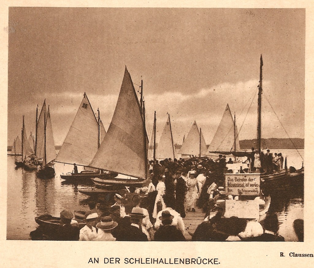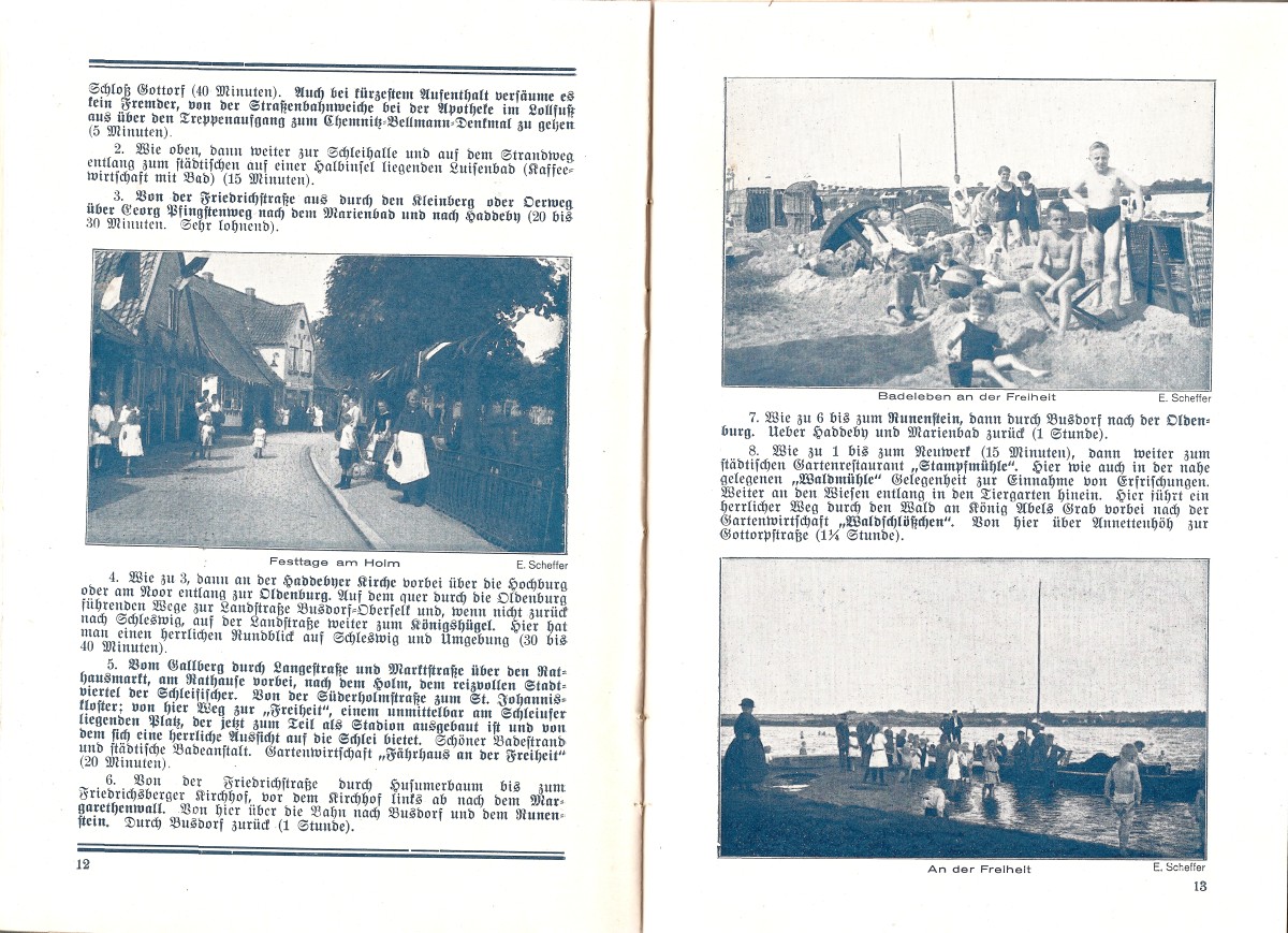 …Vom Gallberg durch Langestraße und Marktstraße über den Rathausmarkt, am Rathause vorbei, nach dem Holm, dem reizvollen Stadtviertel der Schleifischer. Von der Süderholmstraße zum St. Johanniskloster; von hier Weg zur „Freiheit“, einem unmittelbar am Schleiufer liegenden Platz, der jetzt zum Teil als Stadion ausgebaut ist und von dem sich eine herrliche Aussicht auf die Schlei bietet. Schöner Badestrand und städtische Badeanstalt. Gartenwirtschaft „Fährhaus an der Freiheit„…